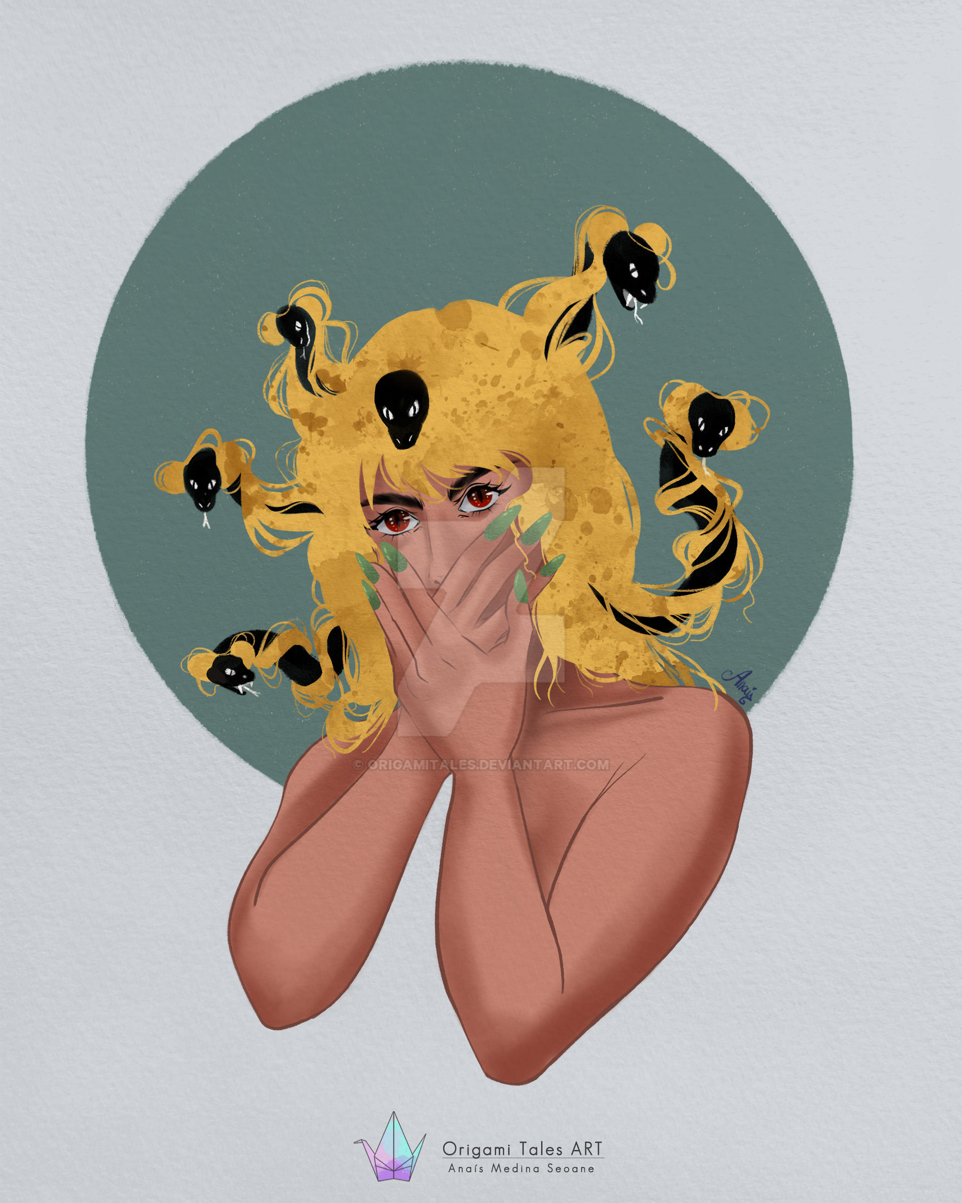 Al perder su pureza y además dentro de su sagrado templo, la Diosa decide castigarla transformando su cabello en serpientes y su mirada en un arma que trasformará en piedra a cualquiera que se aventure a observar su rostro.